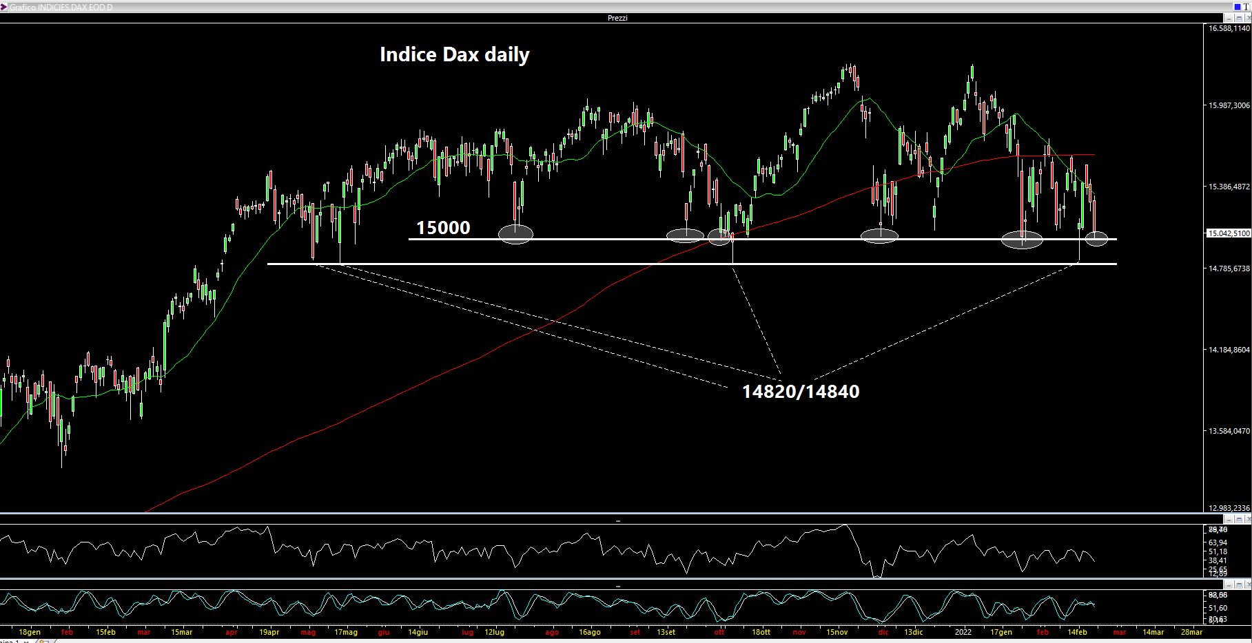 Anche sui mercati europei la situazione è analoga. A titolo di esempio attenzione all'indice Dax su cui abbiamo i 15000 punti testati almeno sei volte nell'ultimo anno ed i 14820-14840 punti testati quattro volte.