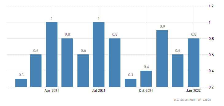 A livello mensile il dato di Gennaio segna una crescita dello 0,8%, contro un consensus dello 0,5% ed una rilevazione di Dicembre dello 0,6% (rivista da 0,5%). I due dati sono rilasciati dall’U.S. Bureau of Labor Statistics.