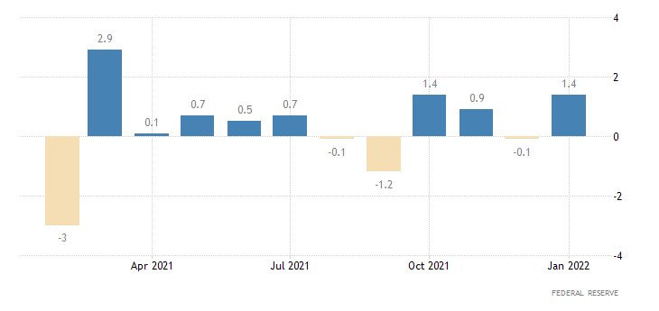 Bene anche la produzione industriale di Gennaio che dopo il -0,1% di Dicembre, cresce dell’1,4%, contro un consensus fissato solamente al +0,4%. Il dato è rilasciato dalla Federal Reserve.