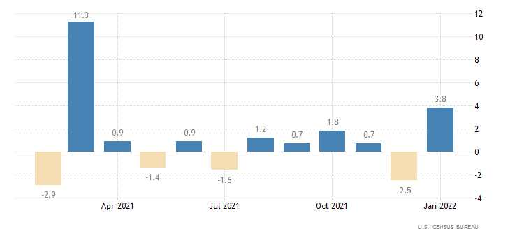 Le vendite al dettaglio Control Group, invece, a Gennaio segnano un +4,8% andando ben oltre al consensus del +1% e migliorando nettamente il dato di Dicembre, quando era stata registrata una contrazione del 4% (dato rivisto da -3,1%). I dati sono rilasciati dall’U.S. Census Bureau.