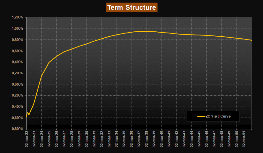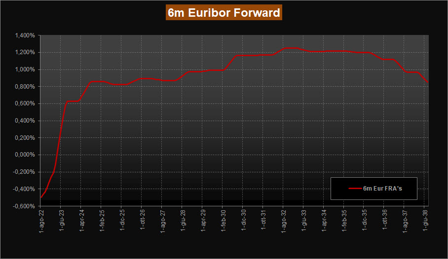 La lettura della ZC-Yield Curve mostra un deciso rialzo dei rendimenti su tutto il tratto della curva. Infatti, rispetto alla scorsa analisi il rendimento della scadenza a 10 anni esplode al rialzo portandosi in area 0,82% rispetto allo 0,42% precedente, mentre la scadenza trentennale si porta ora in area 0,790% rispetto allo 0,50% precedente, rendendo così molto piatta la curva per le scadenze medie e lunghe. Infatti, si modifica la conformazione della curva, anche sulla parte a breve ora molto molto ripida e con l’accentuazione dell’inclinazione negativa per le scadenze dal 2037 in poi. La curva evidenzia ora un massimo di rendimento proprio sulle scadenze 2037-2039, in netto aumento rispetto alla scorsa analisi, passando all’attuale area 0,95% dal precedente 0,63% di rendimento. Molto mossi anche i tassi forward su Euribor 6 mesi sia sul tratto a breve sia su quello a lunga. Ora la curva è ripidissima sulla parte a breve e fornisce previsione di tassi positivi già nei primi mesi del 2023 contro le precedenti letture stimate per il 2024. In salita anche il tratto a lunga ora stabile in area 1,20%.