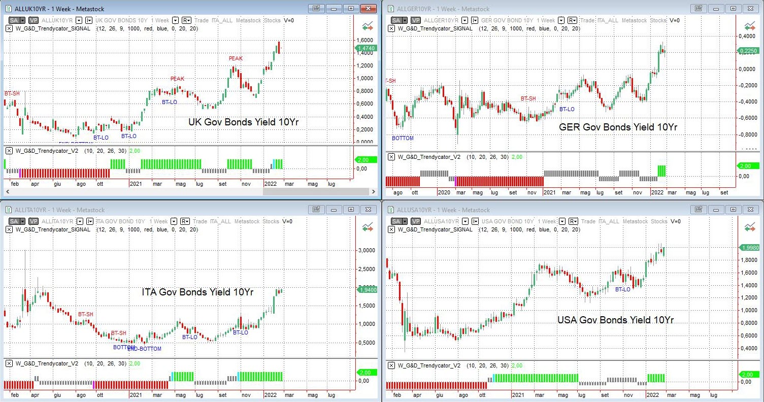 Osservando – a livello di analisi integrata – le curve dei rendimenti dei principali benchmark decennali, il cambiamento del quadro su tutte le aree valutarie è netto rispetto a quanto osservato nella scorsa analisi, con la conferma del cambio di impostazione in ottica strategica. Il modello Trendycator è ormai LONG su tu tutti governativi delle principali aree valutarie, e si è quindi rivelata corretta la nostra ipotesi nella quale dicevamo che “la dinamica dei grafici suggerisce che potremmo avere a breve indicazioni di cambio a livello strategico”. L’area UK ha ora rendimenti ulteriormente in allargamento poco sotto area 1,50% per il GILT e con Trendycator in stato LONG ormai da quattro settimane. Anche il BUND cambia totalmente fisionomia e si porta di slancio in area positiva a 0,22% di rendimento, cosa che non si vedeva da quasi tre anni a questa parte; Trendycator in stato LONG da quattro settimane. Vanno al rialzo anche i rendimenti del nostro Btp che si porta ora in area 1,94%, con Trendycator ormai saldamente LONG che ci ha avvisati con largo anticipo (fine ottobre 2021) sul tempismo da adottare per iniziare a liquidare governativi a lungo termine. Infine, l’area USA che non fa eccezione, con i rendimenti del Treasury decennale che sono ormai a ridosso di area 2,00% e con Trendycator saldamente LONG.