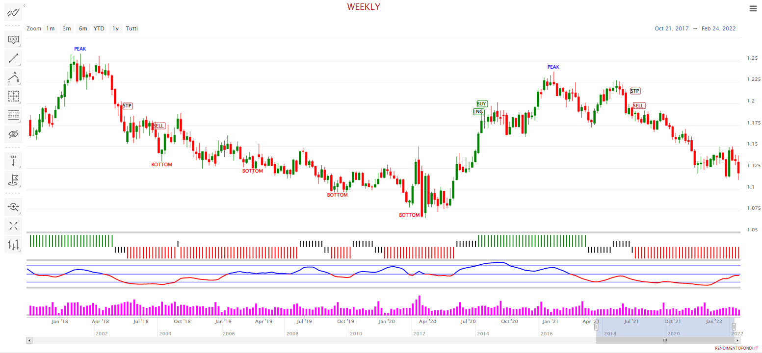 Proseguiamo la nostra consueta analisi del cambio EUR/USD, importante valuta di riferimento per gli investimenti sul reddito fisso, vista la grande varietà di bond denominati in questa valuta. Tutto come da copione, verrebbe da dire. Infatti, a parte l’evento bellico che ha forse accelerato i tempi per la forte ripresa del dollaro contro euro, la lettura fatta nella scorsa analisi si è rivelata corretta.