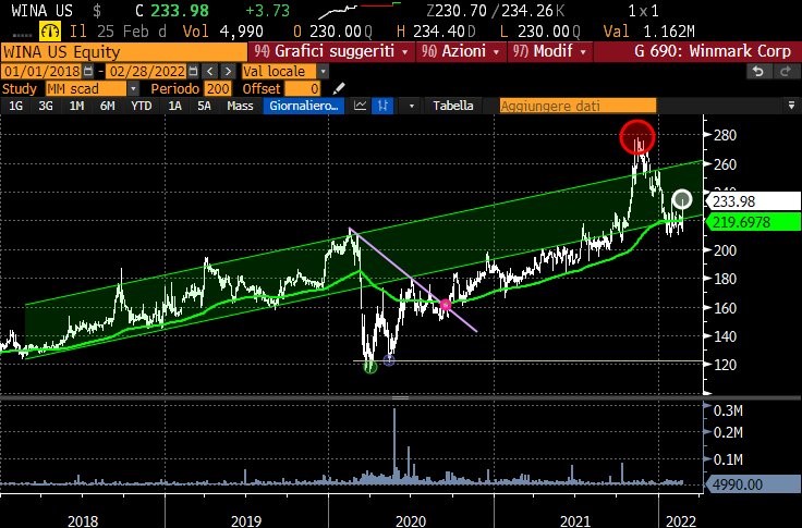 Nell’ultimo trimestre del 2021 le quotazioni di WINMARK, una volta rientrate all’interno del canale rialzista, si sono impennate fino a sfiorare quota $ 280.