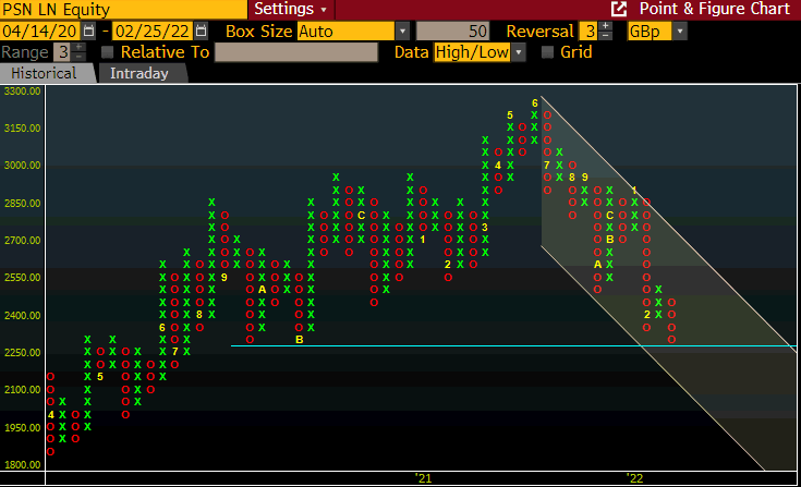 Dal punto di vista puramente tecnico, il titolo non è correlato con l’indice Ftse 100 (0,51 sugli ultimi 10 anni su base settimanale), mentre il grafico Point and figure 50X3 evidenzia un supporto statico proprio sui livelli attuali, nonché un canale discendente da prendere decisamente in considerazione.