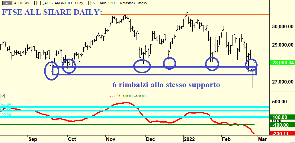 Ma io aspetterei ancora prima di suonare le trombe del rialzo e di sostenere che questa è una occasione per comprare. Tra il rimbalzare nei pressi dei supporti e il rialzo ci passa un bel po’ e la situazione in Ucraina è uscita dai binari della logica e può succedere di tutto e tanto più quanto Putin sarà vieppiù con le spalle al muro: o sporcarsi le mani in una interminabile guerriglia o mollare in qualche modo la presa.