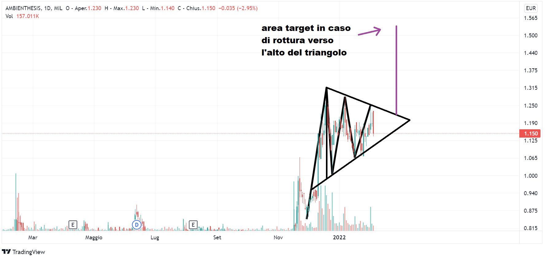 Dalla lista elaborata dall’indicatore proprietario che identifica azioni potenzialmente in rampa di lancio lasciando al lettore esperto il timing di entrata, abbiamo nuovamente pescato i titoli Ambienthesis e Renergetica per fare il punto sulla loro evoluzione grafica. Vi presentiamo anche un breve triangolo formatosi sul grafico di Sourcesense.