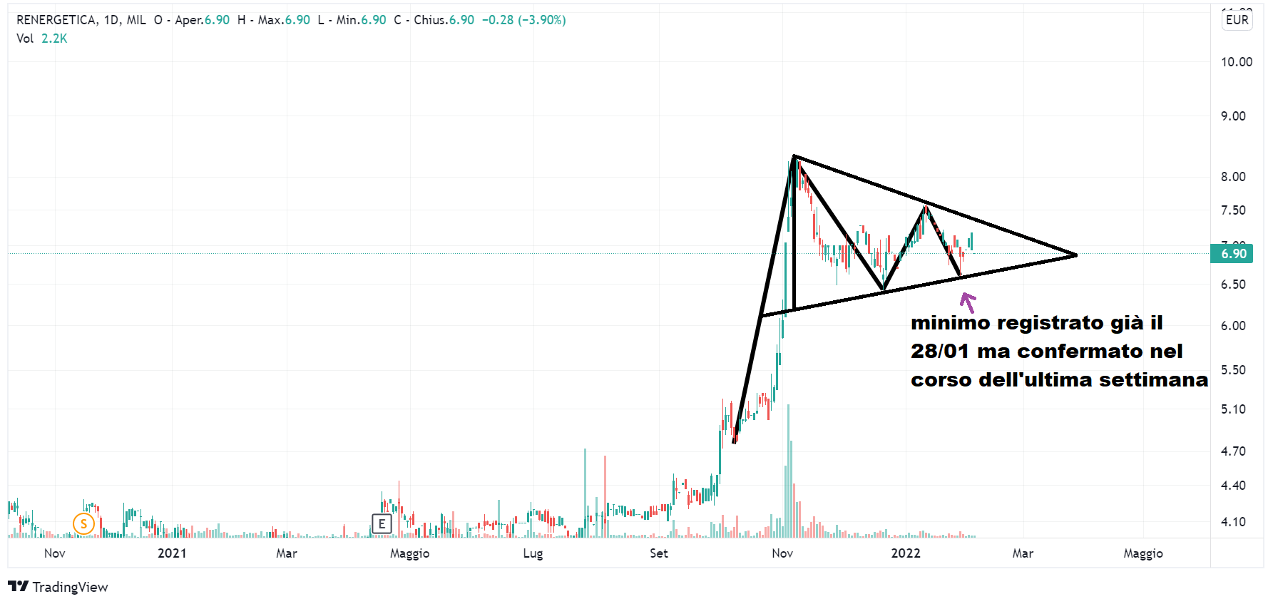 Proseguiamo con un secondo aggiornamento grafico. Già la scorsa settimana avevamo analizzato su queste colonne la situazione grafica di Renergetica (venerdì Lombard Stock Index di 36), segnalando un triangolo in formazione “sporco”. Continuiamo allora a tenere d’occhio il movimento di questo titolo. Rinfreschiamoci la memoria, rivediamo il percorso che ha effettuato Renergetica sul grafico negli ultimi mesi e che ha portato ad un triangolo simmetrico. Dopo la forte spinta rialzista verificatasi tra fine ottobre ed inizio novembre, il titolo ha toccato il primo massimo del triangolo il 5 novembre, con una quotazione di 8,30. Il primo minimo corrisponde ad una quotazione di 6,42 che viene registrato il 20 dicembre. Il secondo massimo viene raggiunto nelle sedute dell’11 e 12 gennaio con una quotazione di 7,56. Il 28 gennaio poi è stato registrato il secondo minimo pari a 6,60, minimo che nel corso dell’ultima settimana non è stato superato verso il basso.