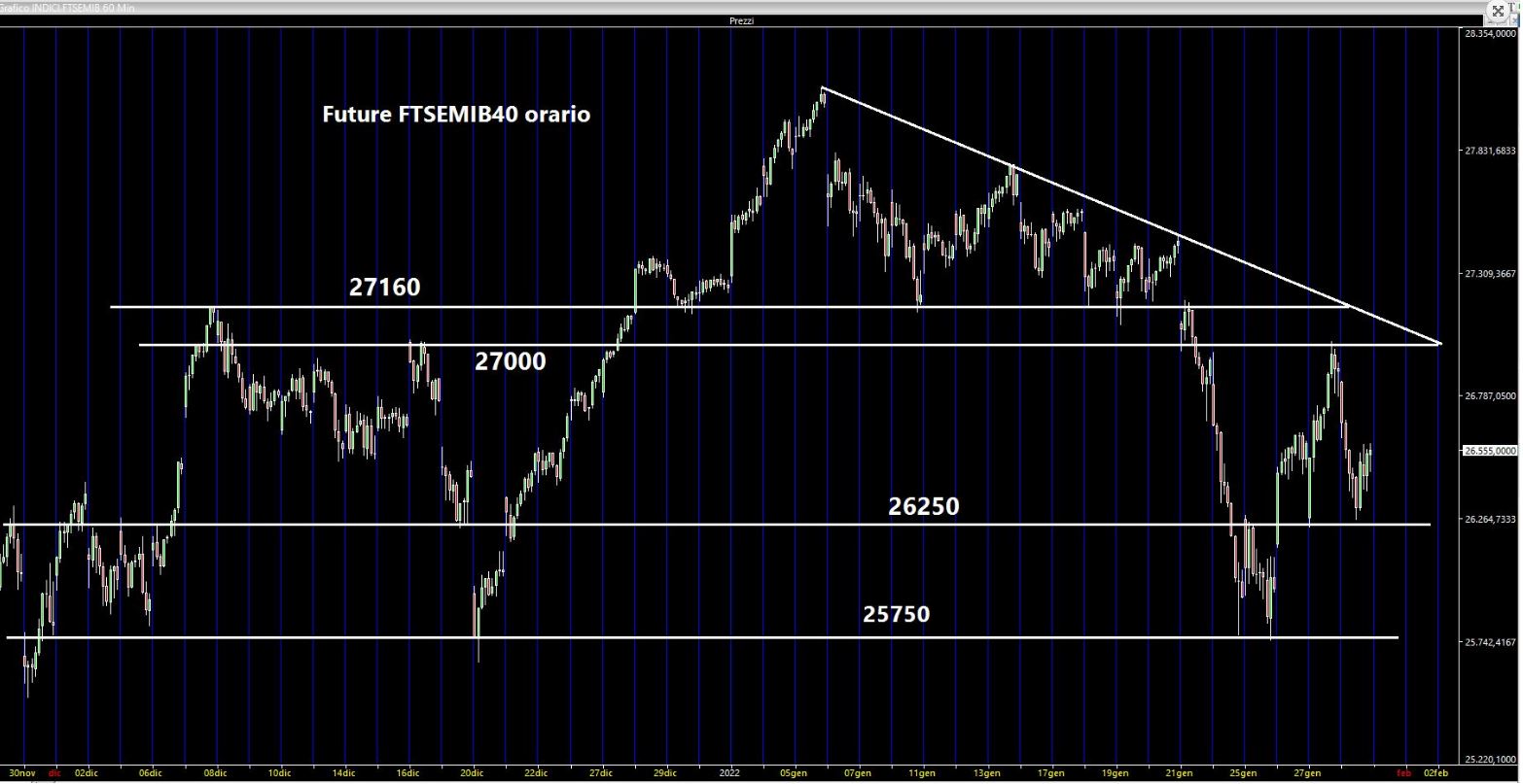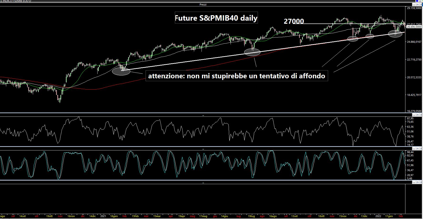 Di fatto abbiamo avuto un tentativo di uscita dal "tappo" 27000-27160 con una estensione fuori programma nella seduta di mercoledì e poi un ripiegamento subito dopo. Nel complesso e come mi aspettavo il mercato italiano è stato mediamente più forte nel post elezione Presidente della Repubblica ma poi come sempre (e come vedremo) i nodi sono comunque venuti al pettine.