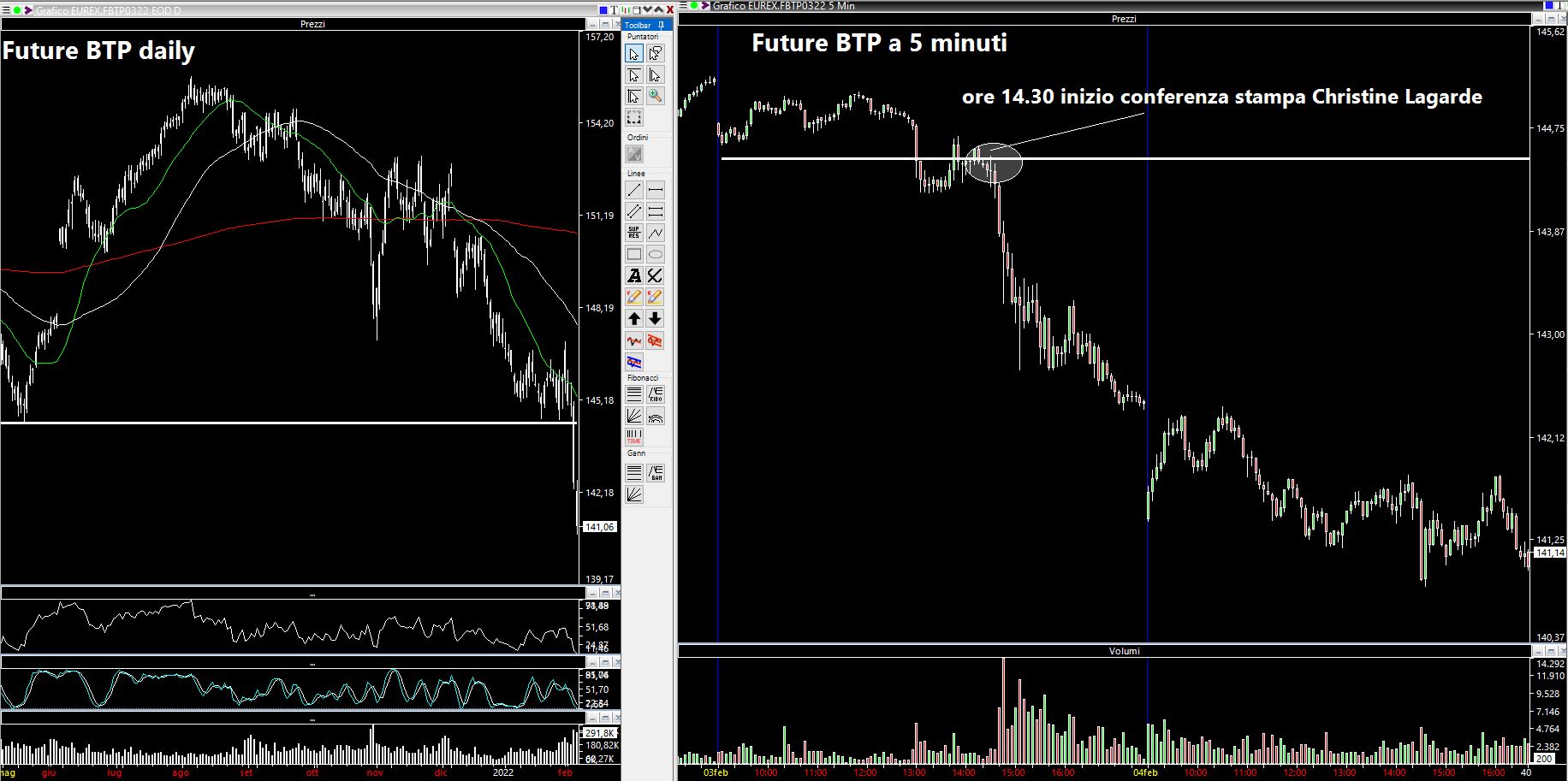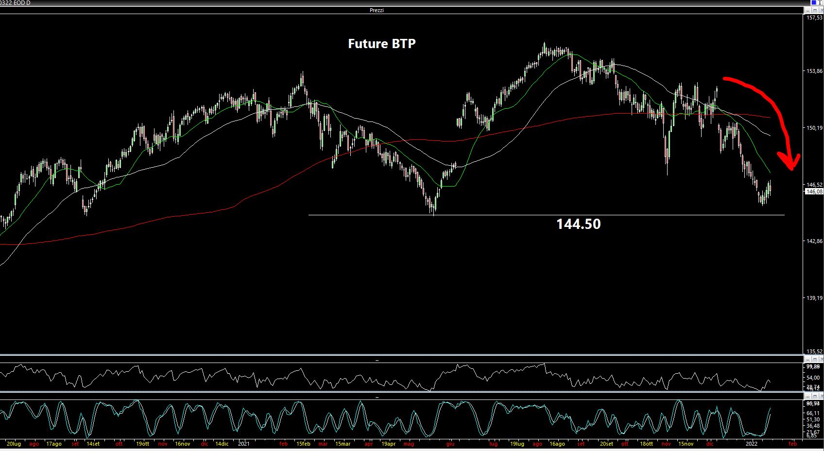 Un paio di settimane or sono avevo indicato come livello "chiave" (ma MAI "chiavi in mano") i 144.50 di Future BTP. Grazie alle parole della presidente BCE Lagarde tale livello è stato prontamente rotto dopo essere stato testato millimetricamente un paio di volte negli ultimi quindici giorni. Il grafico postato in quell'articolo era il seguente (link: https://www.lombardreport.com/2022/1/15/prova-6/):