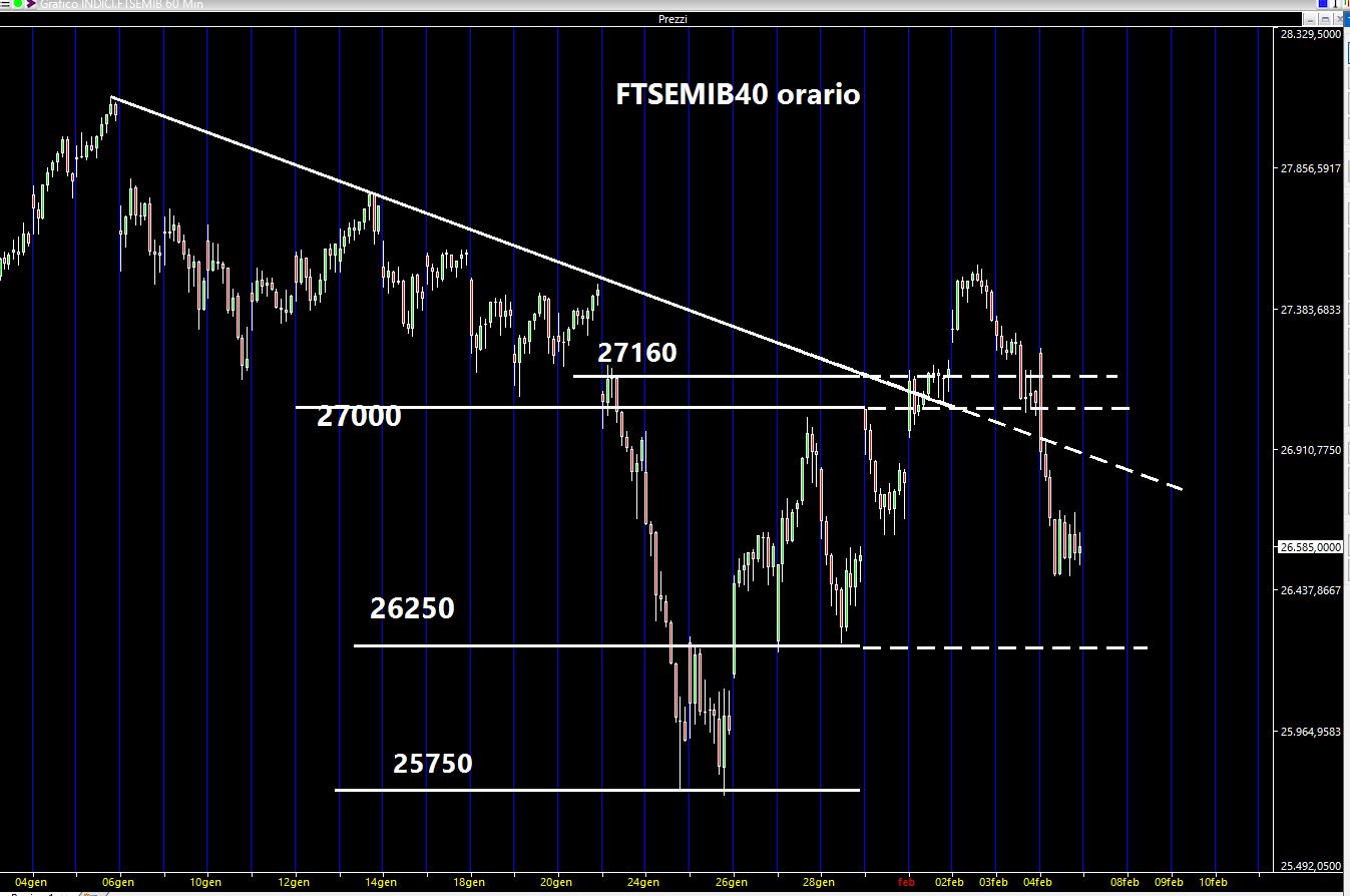 Per la prossima settmana sull'Italia continuerò a monitorare i 27000/27160 punti al rialzo, mentre al ribasso i 26250 e poi i 25750 su un timeframe orario (vedere il grafico successivo)
