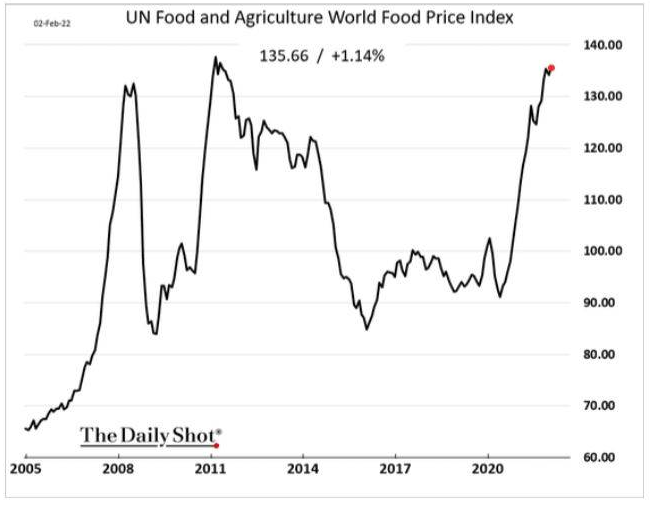 “Pensiamo a chi alla sera deve preparare la cena” ha chiosato la Lagarde presidente della BCE alla conferenza stampa di mercoledì scorso. Sicuramente Lei non se la prepara perché se il comunicato stampa della BCE è stato uguale a quello di dicembre (inflazione che ?) i toni della conferenza stampa erano invece molto accomodanti sull’inflazione della serie “poi vediamo a marzo che ci sarà da fare”: se la Lagarde andasse a fare la spesa ogni giorno si sarebbe resa conto che i prezzi stanno volando, basta pensare che a volte quando io che la spesa la faccio ogni due o tre giorni compro il pane mi viene da chiedere perché non convenga comprare filetto di maiale. E io che non sono la Lagarde vi assicuro che l’inflazione c’è ed è destinata a durare per 2 ragioni: la prima è che non esiste un mondo senza inflazione, forse ci siamo abituati ma dobbiamo riconoscere in cuor nostro che di solito fare debiti costa, la seconda è che l’inflazione non è mai transitoria perché viene trasmessa ai salari e da qui entra in circolo nell’economia. E la domanda di lavoro è tale almeno nelle regioni del Nord Italia che questo meccanismo è in moto: mi è capitato di vedere per la prima volta dopo anni annorum diversi cartelli lungo la strada con scritto “cercasi montatore”, “cercasi saldatore”, “cercasi elettricista”. E che il cibo costi sempre più non c’è bisogno di mandare Tomasini tra le corsie di un supermercato ma lo prova più comodamente il grafico che segue che mostra il prezzo del cibo e dei prodotti alimentari agricoli come indice aggregato: siamo vicini ai picchi del 2011.