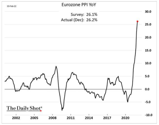 E’ che l’inflazione esista nonostante i lodevoli intenti della Lagarde lo dimostra il grafico che segue che indica come il PPI dell’Eurozona sia salito “solo” del 26%: