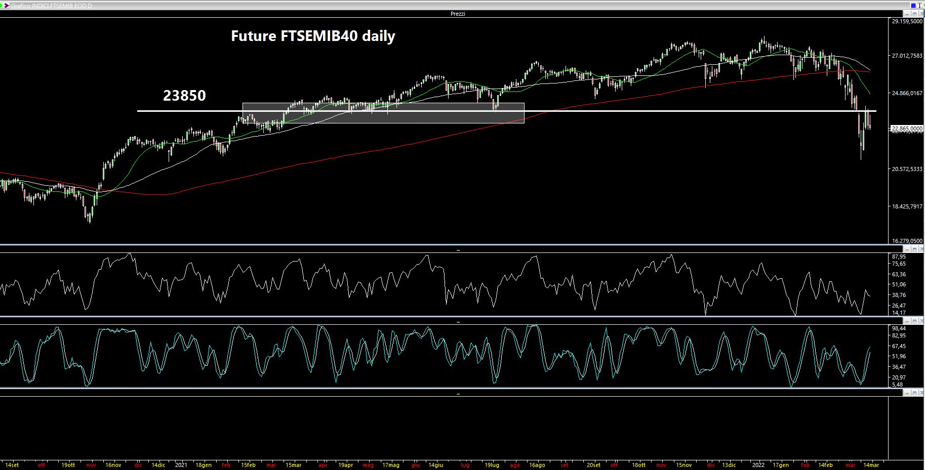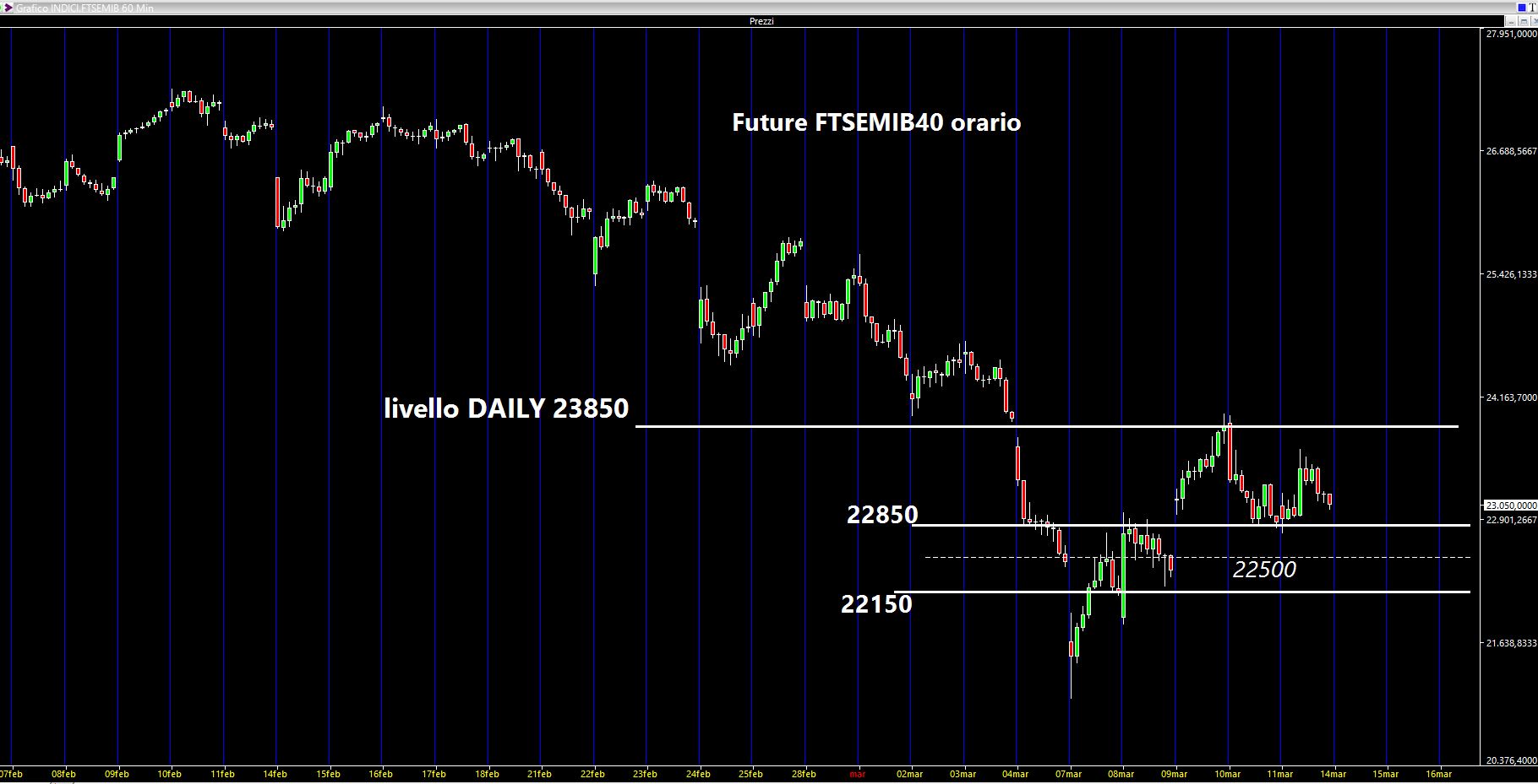 Ho scritto che i 23850 punti sono un livello importante sul chart daily e quindi inevitabilmente assumono una valenza anche su timeframe più ristretti come quello orario. Esistono tuttavia due livelli da monitorare con attenzione per scongiurare un nuovo test dei minimi di lunedì scorso: 22850 prima e 22150 poi. Al loro interno si trovano i 22500 che sono un'area intermedia in cui il derivato potrebbe cercare di lateralizzare per le prossime cinque sedute.