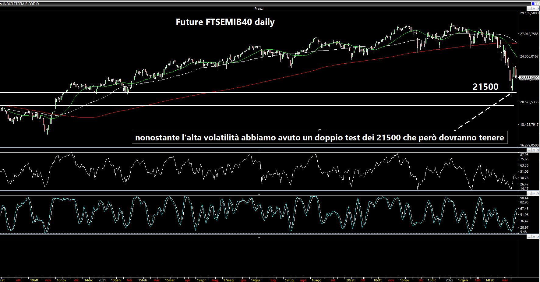 Quanto sopra riportato è ben visibile sul grafico giornaliero dove nella seduta di lunedì abbiamo avuto il climax di mercato con test dei 21500 che hanno coinciso indicativamente anche con l'open della seduta successiva di martedì quando si è concretizzato il rimbalzo.