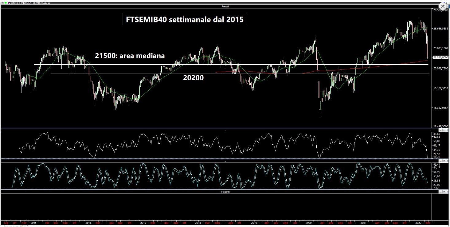 Nella passata ottava avevo postato questo grafico settimanale sul future FTSEMIB40 (link articolo: https://www.lombardreport.com/2022/3/5/putin-ha-comunque-ragione/). Il mio film era infatti di un'area "cuscinetto" su cui il derivato avrebbe potuto trovare un potenziale punto di appoggio e collocabile in un ampio range individuabile tra un minimo a 20200 ed un massimo mediano a 21500