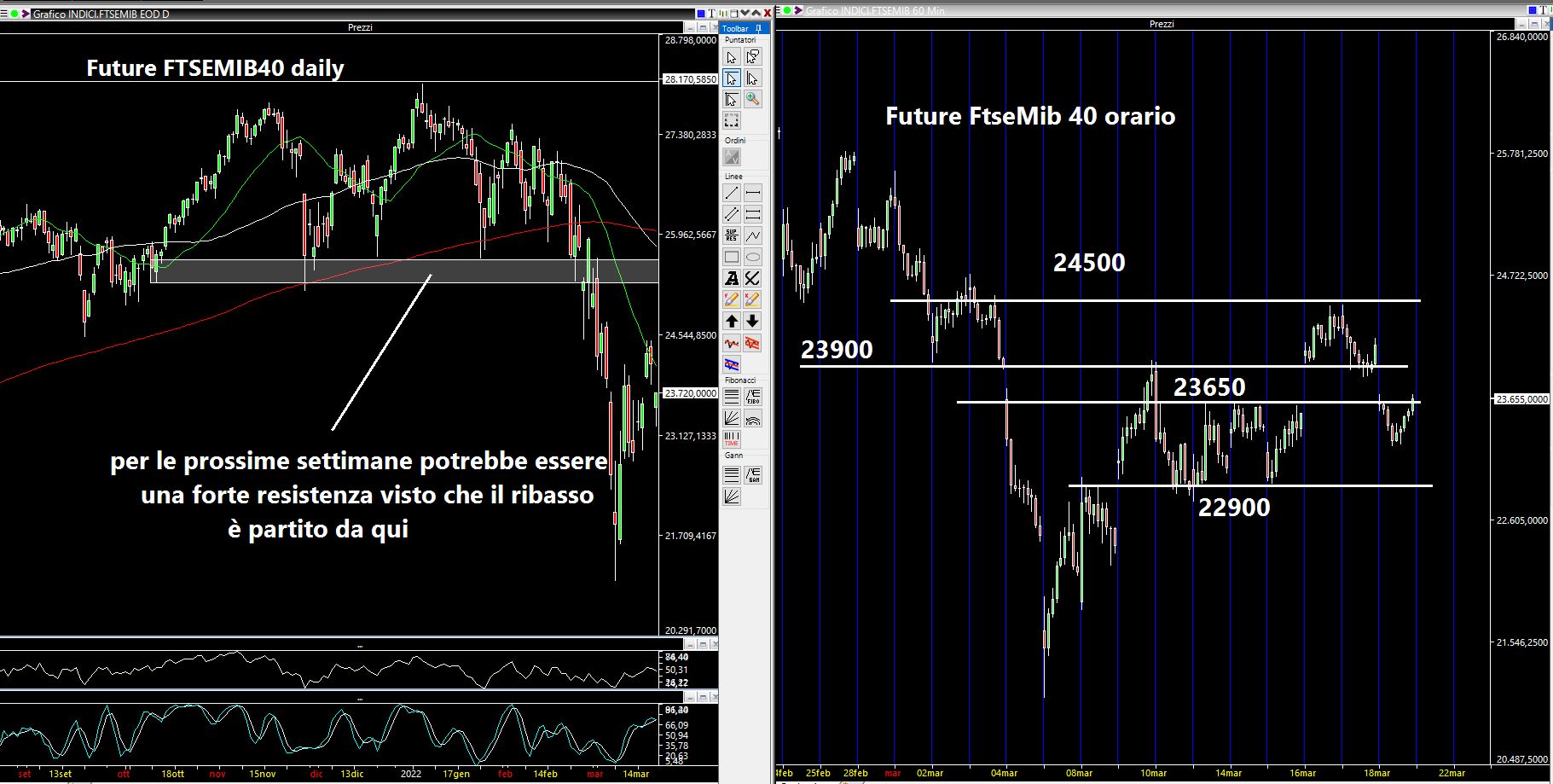 Procedo subito all'analisi dei livelli sul future FTSEMIB40 scadenza giugno per la prossima ottava. Personalmente credo che il mercato stia continuando la fase di assestamento e al momento sono drasticamente calati i volumi sui titoli, segno che chi doveva vendere è uscito completamente (la "capitolazione" famosa di cui avevo scritto nelle scorse settimane), qualcuno ha comprato ma al momento non c'è comunque una vera e propria corsa agli acquisti. Parlavo con altri operatori che hanno la mia stessa view: molto probabilmente qualcuno è "saltato" e non mi riferisco necessariamente ad un trader in carne ed ossa. Questo lo si nota proprio dai volumi. Torniamo all'analisi delle aree da monitorare. Il supporto importante per le prossime sedute è collocabile a 22900 e a 22500. Le resistenze sono a 23650, 23900 e 24500. Se notate abbiamo livelli che nel complesso sono abbastanza vicini tra di loro e questo è il segno di contrazione di volatilità (già anticipato in precedenti articoli relativamente al mercato americano). Sta quindi tornando il sereno o è semplicemente la quiete prima della tempesta? Credo che sia più valida la prima ipotesi ovvero quella di un mercato che se non sarà orientato al rialzo dovrebbe almeno lateralizzare ma non scendere. Certamente siamo in balìa degli eventi bellici ma credo che le Borse li abbiamo comunque già metabolizzati (escludo al momento l'ipotesi escalation); in intraday noto ad esempio che a dichiarazioni che allontanano l'ipotesi del fine guerra il mercato reagisce inizialmente male ma poche ore dopo si riprende e questo sta a significare che le vendite vengono riassorbite. Lo stesso ragionamento nel caso di dichiarzioni positive che fanno inizialmente salire e poi mano a mano ci si "rimangia" il movimento.