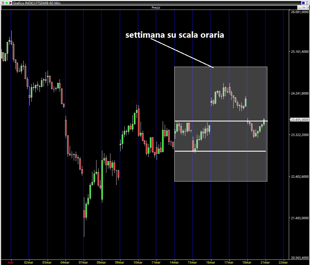 Buon fine settimana a tutti. Con la seduta di venerdì si è chiusa la prima scadenza tecnica importante con un nulla di fatto su scala settimanale almenoper quanto riguarda il mercato italiano. Utilizzando il nuovo contratto scadenza giugno e timeframe orario notiamo come il mercato sia rimasto sostanzialmente in trend laterale nelle giornate di lunedì e martedì, come sia improvvisamente salito mercoledì e giovedì per poi tornare al punto di partenza nell'ultima seduta di contrattazione. Volatitlità quindi in calo ed indecisione generalizzata senza particolari spunti o temi operativi.