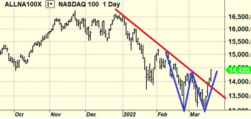 I prezzi del Nasdaq 100 che riproduciamo qui sotto infatti hanno chiuso al di sopra del massimo relativo precedente disegnando quello che è un doppio minimo (figura blu) mentre contemporaneamente violavano la trendline discendente degli ultimi 2 mesi (linea rossa).