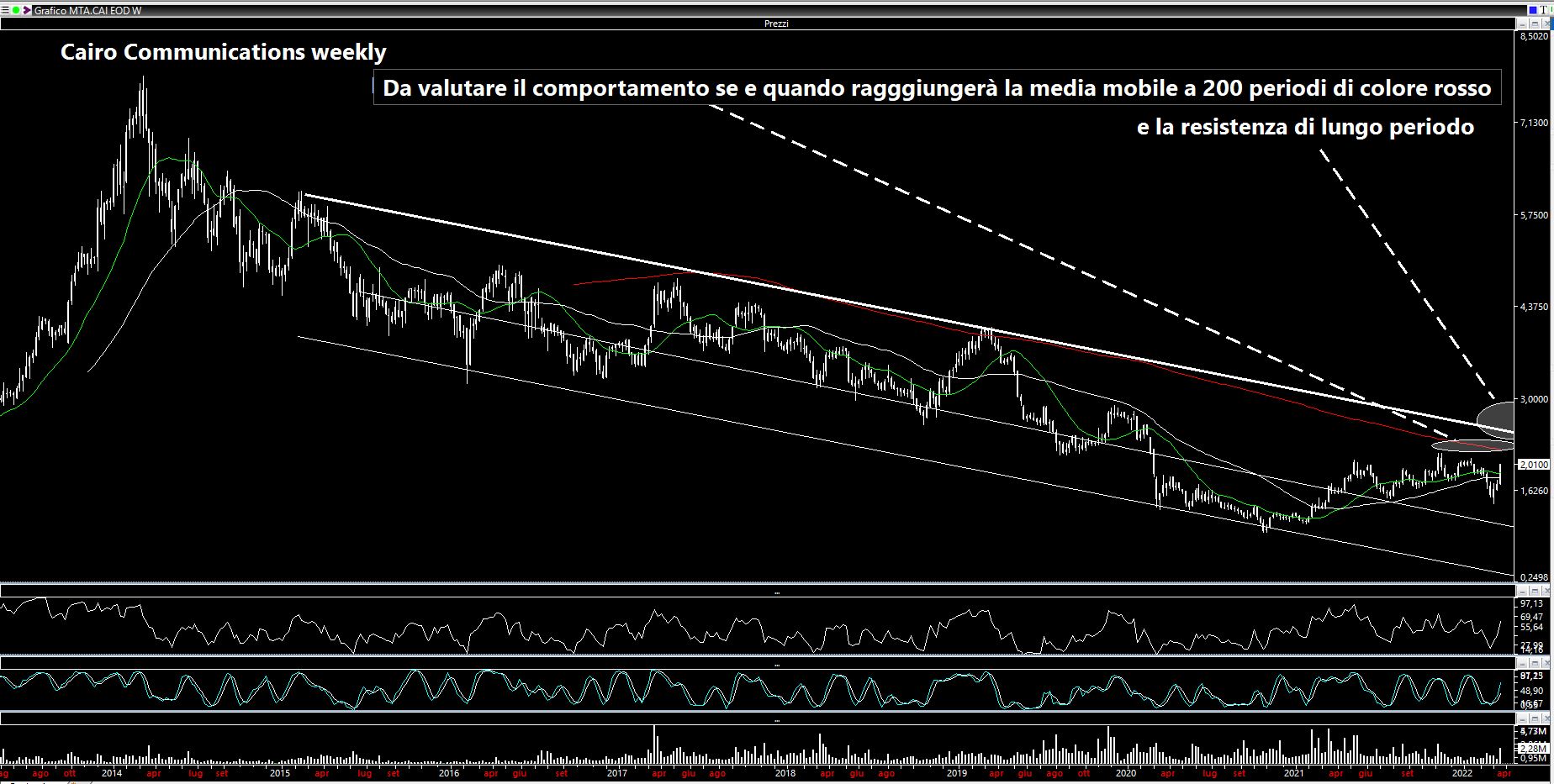Per quanto concerne i titoli sottili avevo fatto riferimento ad una azione "risanata": RCS. Il rialzo su scala settimanale è stato del +7% abbondante. Lunedì ha pubblicato ottimi risultati sul 2021. I ricavi sono infatti aumentati del 12.9% a 846.2 milioni grazie alla crescita dei ricavi pubblicitari. Il margine operativo lordo è aumentato del 68% a 144.5 milioni di euro e l'utile è passato da 31.7milioni del 2020 a 72.4 milioni. In forte miglioramento anche l'indebitamento, sceso a 144.9 milioni dai 214.5 milioni di inizio anno. E' poi stato proposto lo stacco di un dividendo pari a 0.06 euro per azione il 16 maggio di quest'anno.