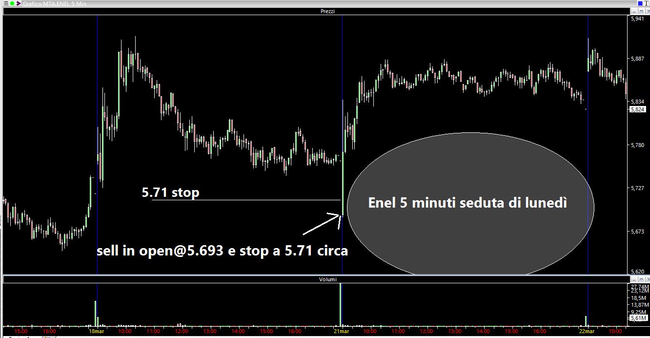 Parto subito dal mio primo trade settimanale basato su una idea operativa di cui avevo scritto sabato scorso: un potenziale short sui titoli energetici dovuto alla (eventuale fino a quel momento) tassazione degli extra profitti per fronteggiare il caro energia. Primo trade in intraday e primo loss della settimana. Personalmente avevo scelto il titolo Enel in open lunedì: leggero gap down iniziale rispetto al close del venerdì precedente e possibilità di andare a rompere un pò più in basso i supporti collocati tra 5.65 e 5.67 euro. Questo era il mio film. Peccato però che le macchinette fossero state tarate sin da subito sul versante long e quindi OUT: onde evitare che un film drammatico potesse diventare un horror ho subito "stoppato" il trade accontentandomi di un piccolissimo loss. Come ho spesso scritto su queste colonne è meglio evitare che una brutta operazione diventi un Titanic facendoci così perdere concentrazione su altre eventuali opportunità.
