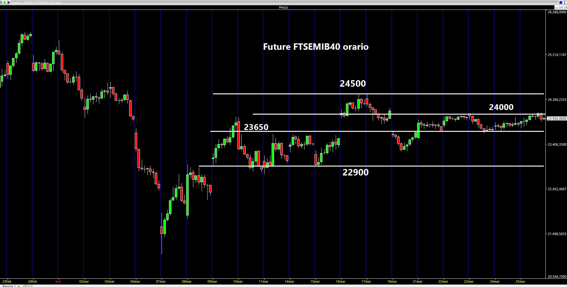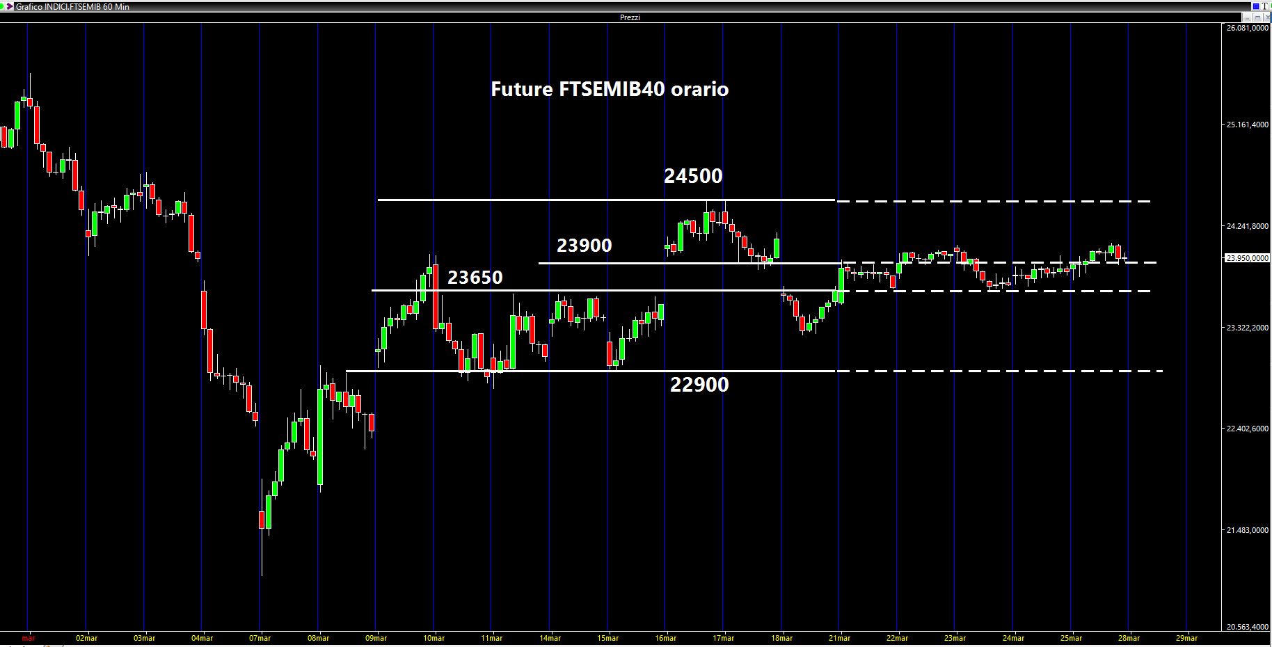 Per la prossima settimana terrò in considerazione i seguenti livelli: come estremi i 24500 ed i 22900 all'interno dei quali la fascia di baricentro sarà collocabile sempre tra 23650 e 24000 (anziché 23900). Di fatto la riduzione di volatilità corrisponde ad una compressione del range che prima o poi verrà rotto da un lato o dall'altro. Credo ed auspico che gli eventi bellici ai quali i mercati si sono abituati vengano meno nel più breve tempo possibile e questo potrà darci un minimo di direzionalità in più (e soprattutto di volumi) da poter sfruttare nell'operatività.