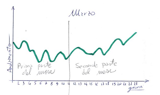 Di seguito trovate invece il comportamento delle 19 sedute (a ieri, venerdì 25 marzo) del Nasdaq Composite. Per il momento (mancano ancora 4 giorni al nuovo mese) il trend e la sua svolta sono stati centrati. L'importante però è non dare MAI nulla di scontato: la Borsa è femmina ed è più evoluta di noi che la osserviamo e quindi avrà sempre e comunque ragione,