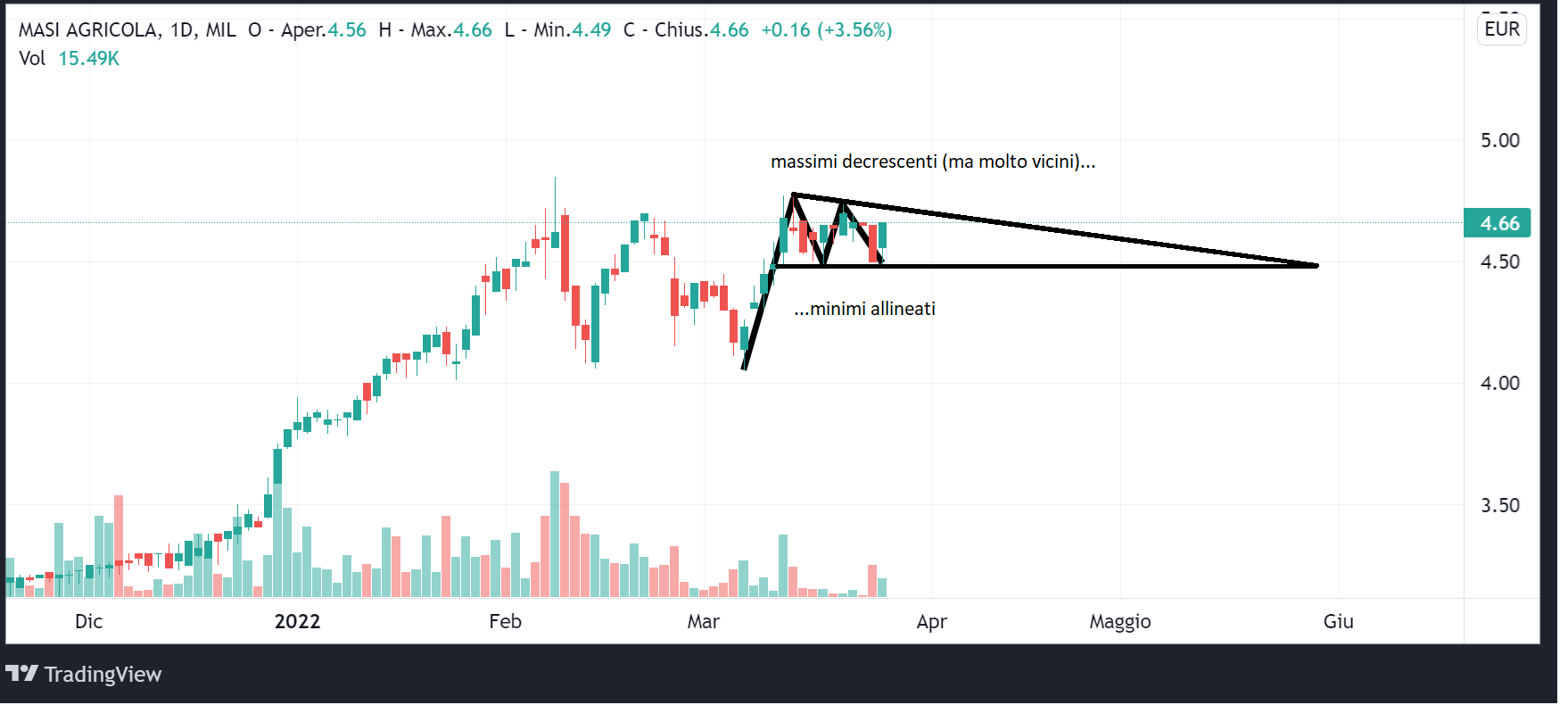 Elenco alla mano, partiamo da Masi Agricola, titolo che sabato presentava un Lombard Stock Index di 28 (nella TOP 10). Sostanzialmente il titolo ha vissuto una fase rialzista da ottobre ad inizio febbraio, per poi entrare in una fase di movimento laterale, in una fascia che nel lato alto ha come riferimento il massimo di 4,85 dell’8 febbraio e nel lato basso una quotazione in area 4,05. Nelle ultime sedute poi abbiamo individuato un piccolo triangolo discendente, formato da due massimi decrescenti, di 4,77 (11-14 marzo) e 4,74 (21 marzo), e due minimi di 4,49 (17-25 marzo). Masi Agricola è un’azienda vitivinicola radicata in Valpolicella Classica che produce e distribuisce vini di pregio. Proprio venerdì 25 marzo il CdA di Masi Agricola ha approvato il progetto di bilancio e il bilancio consolidato dell’esercizio chiuso al 31 dicembre 2021. L’EBITDA consolidato è pari a 12,9 milioni di euro, dato in crescita sia rispetto al 2020 (5,5 milioni di euro) che al 2019 (11,2 milioni di euro). L’utile netto consolidato passa dai 795 mila euro del 2020 ai 5,4 milioni di euro del 2021, mentre i ricavi netti consolidati passano dai 51,7 milioni del 2020 ai 66,4 milioni del 2021. Il CdA di Masi Agricola proporrà all’assemblea la distribuzione di un dividendo unitario ordinario, al lordo delle ritenute di legge, di 8 centesimi per azione.