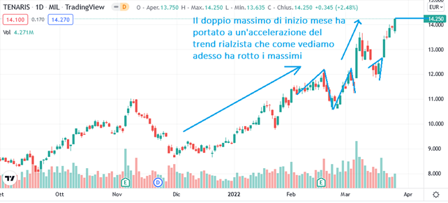 Il trend in corso è evidente: nonostante il rumore forte ben visibile anche allo stadio attuale, il risultato alla chiusura di venerdì è quello di una rottura dei massimi storici (era da fine 2018 che non venivano raggiunti questi prezzi) e di una crescita che, da luglio ad oggi, è oltre il 50%. Dal grafico vediamo che il doppio massimo raggiunto a inizio mese e poi negato con il breakout di entrambi i massimi è stato portatore di un’accelerazione rialzista, con i prezzi che oggi superano i 14.20 euro.