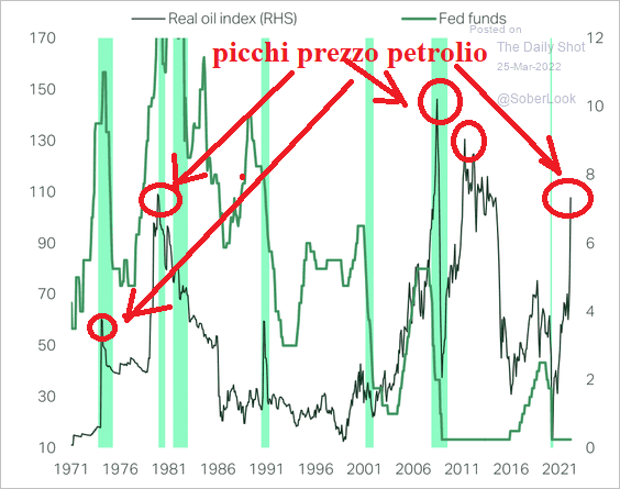 A livello macro in molti temono una recessione per gli elevati costi dell’energia. Vi mostro di seguito un grafico che sta tenendo svegli i money managers di mezzo mondo: cerchiati in rosso abbiamo i picchi del prezzo del petrolio mentre nelle aree verdi i periodi di recessione e la linea verde infine sono i Fed Funds ovvero i tassi di interesse ufficiali.