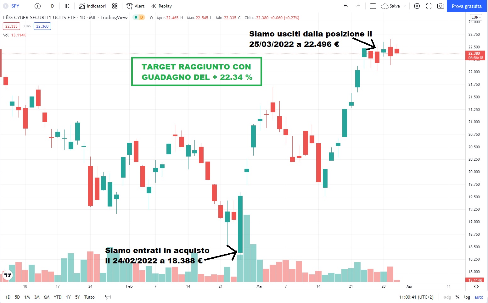 Come potete vedere dal grafico siamo entrati in posizione di acquisto il 24/02/2022 ad un prezzo di 18.388 € e siamo usciti circa un mese dopo, il 25/03/2022 vendendo a 22.496 €, ottenendo un lauto guadagno del +22.34 %.