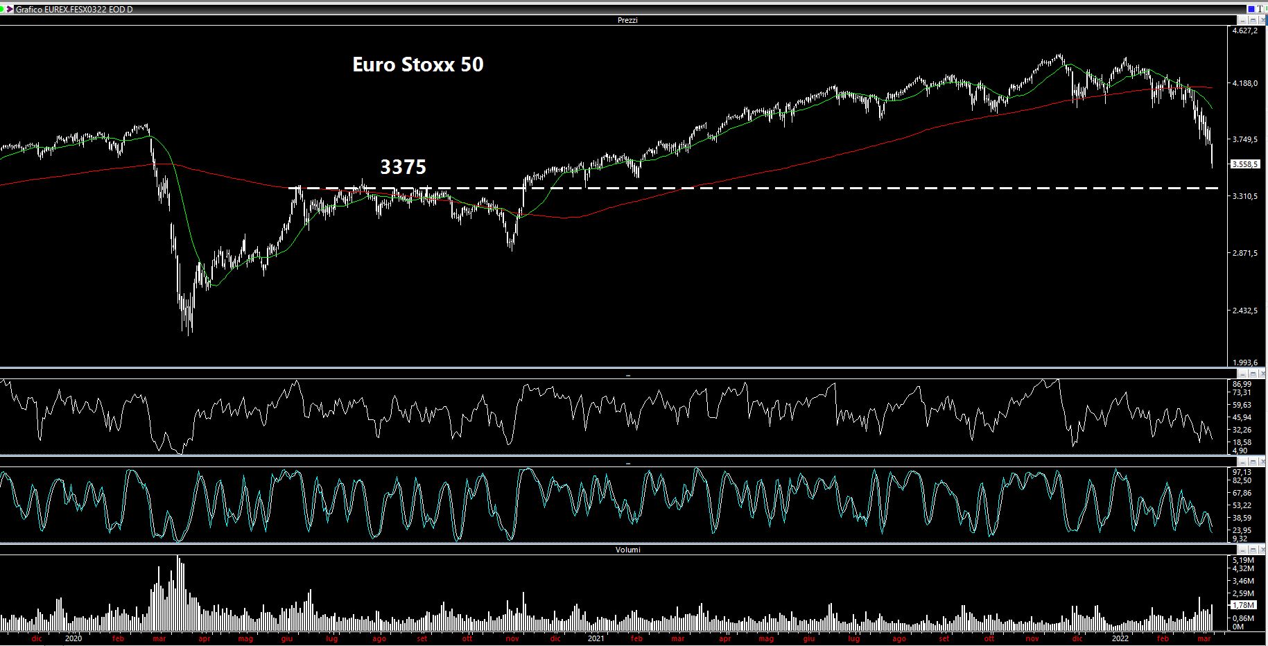 A livello europeo abbiamo poi l'Euro Stoxx 50 che ha ancora un pò di strada almeno fino a 3375 punti (venerdì ha chiuso a 3558.5 punti), quindi almeno un 5% di ribasso, poi si vedrà.