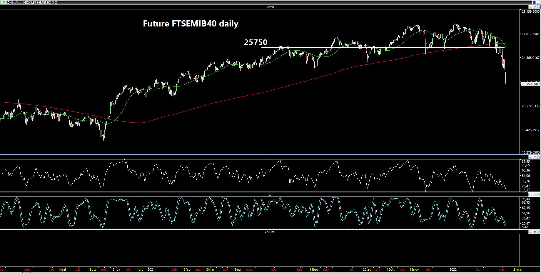 "Sul future FTSEMIB40 invece credo sia importante il recupero (confermato da più chiusure sopra il livello) dei 25750 punti per pensare che il mercato si possa stabilizzare"