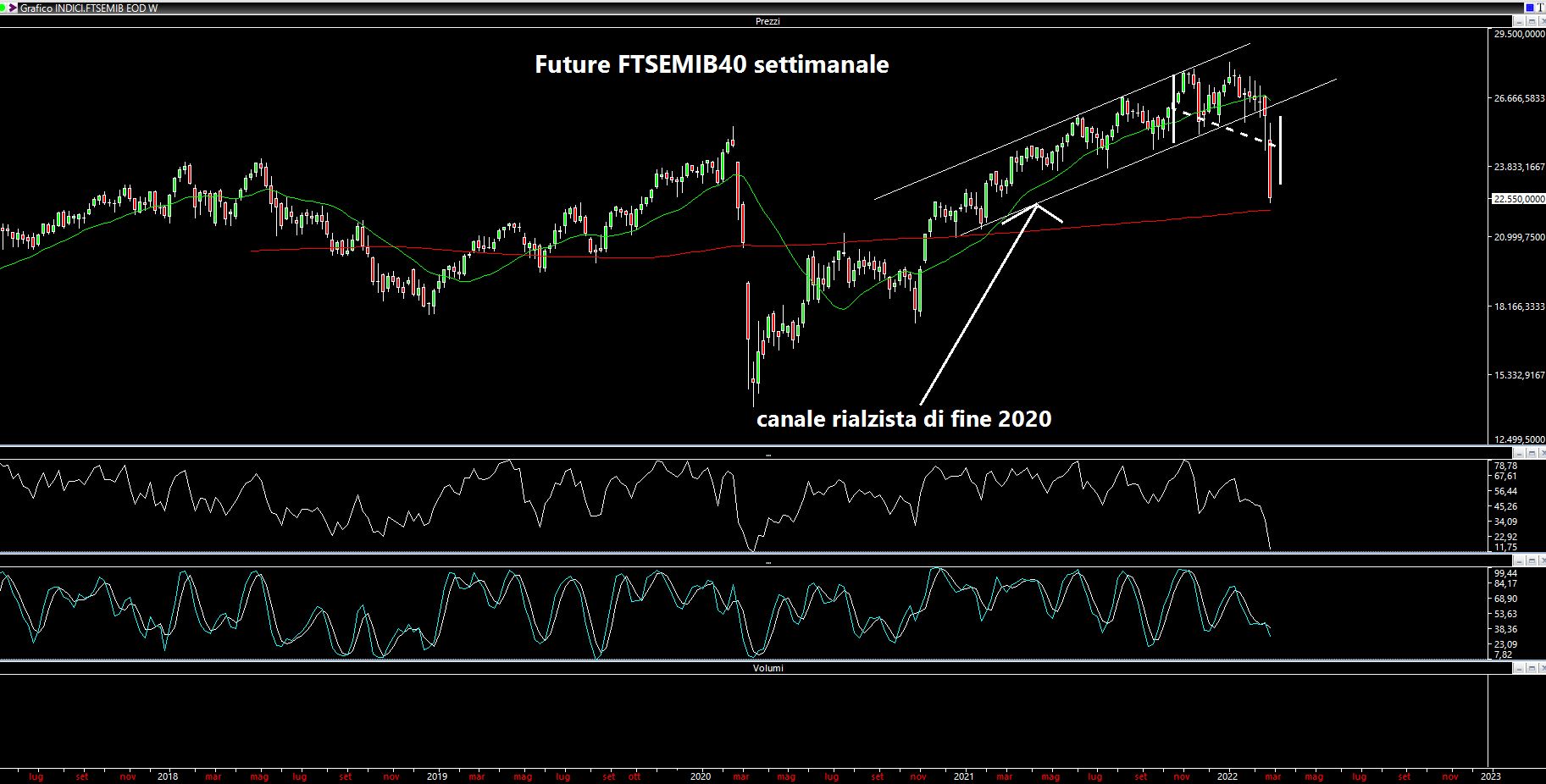 Purtroppo la previsione (e sensazione) iniziale della porta infernale posta a 25750 è stata drammaticamente azzeccata (link: https://www.lombardreport.com/2022/2/12/spero-di-sbagliarmi-ma-they-re-knoking-on-the-door/). Il grafico successivo si riferisce naturalmente al 12 febbraio, solo tre settimane fa.