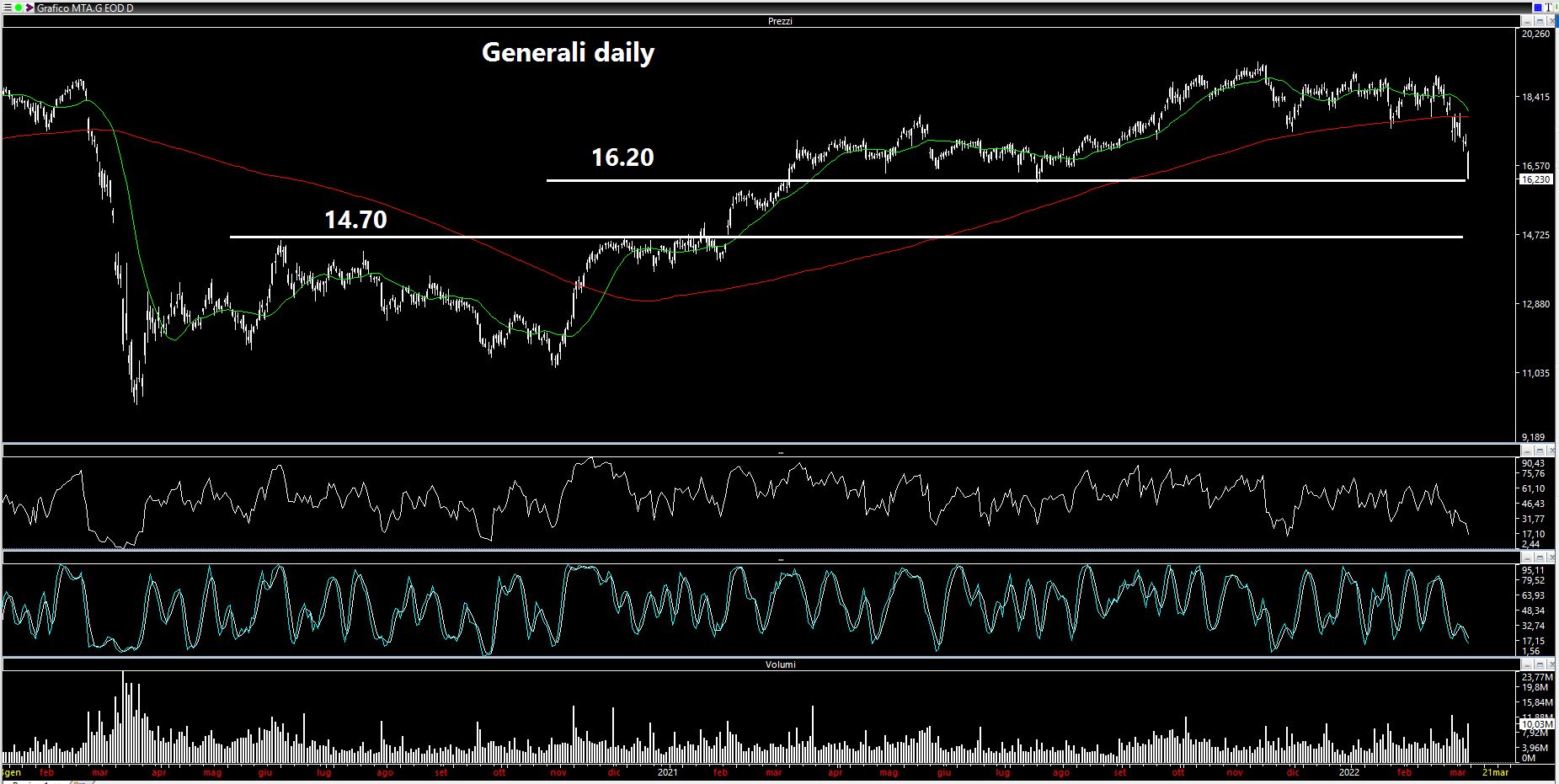 Altra azione CORE è Generali che rotti i 16.20 troverebbe come supporto "logico" i 14.70 da cui era partita al rialzo alla fine del 2020. Chiaramente si tratta di titoli driver sui quali eventualmente imposto una operatività stretta in intraday e che comunque vanno inevitabilmente seguiti per pensare "dove e quando" il mercato possa trovare un punto di appoggio.