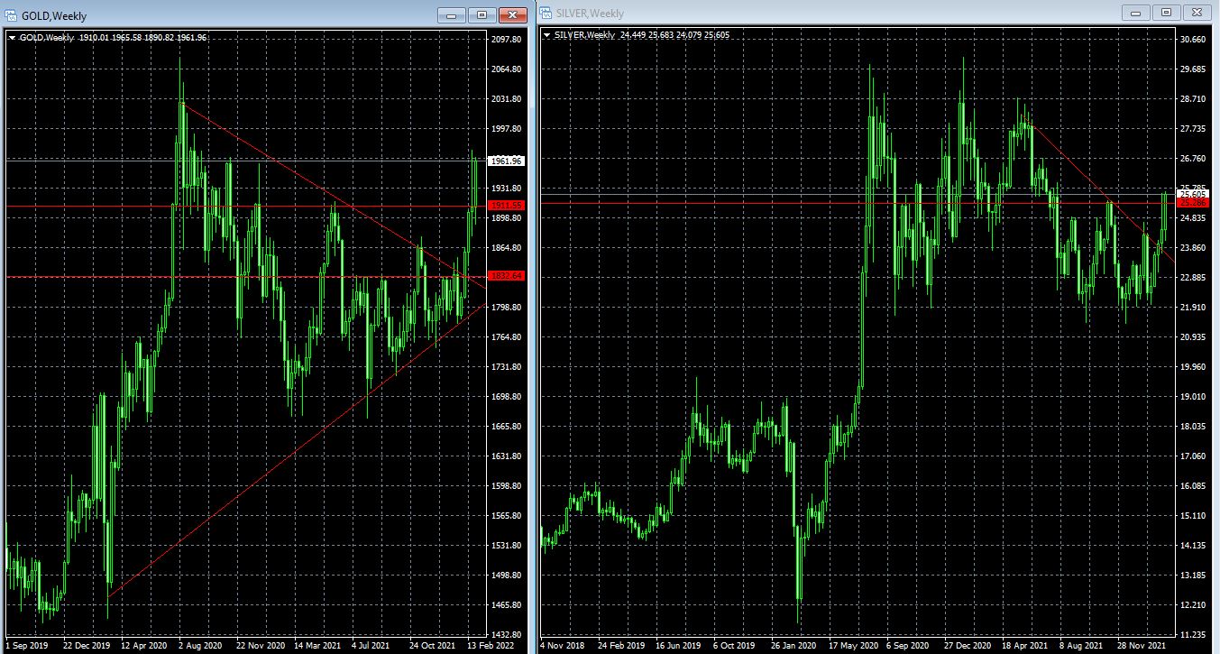 In questo contesto quello che poteva essere un potenziale falso breakout di euro diventa un segnale preoccupante visto che in settimana la commodity si è riportata nuovamente sui massimi dell'ottava passata. Idem per l'argento (di seguito i grafici su scala settimanale; a sinistra l'oro a destra l'argento).