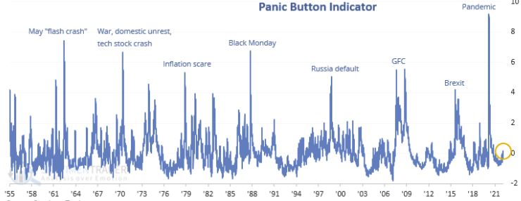 Il sentiment tra gli operatori è sempre più sbilanciato sul versante short come ho già avuto modo di scrivere (almeno in Europa). C'è però un MA che è racchiuso nel grafico seguente (Fonte: SetimenTrader). Si tratta di un "bottone" di iper panico che si è certamente manifestato negli ultimi 80 anni in occasione degli schok degli anni '70, del lunedì nero del 1987, del default russo alla fine degli anni '90, della crisi del 2008, della Brexit e della pandemia. Diciamo che rappresenta l'evento estremo. Ad oggi ho vissuto parzialmente quello del default della Russia nel '97-'98 (stavo finendo l'università e vivevo di Danimarca) ma ho vissuto in pieno la crisi del 2008, la Brexit e ovviamente la Pandemia.