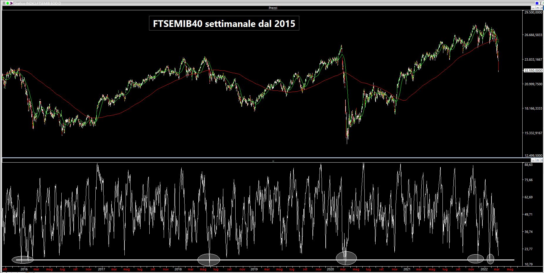 Ci sono considerazioni che ho fatto tra me e me questa settimana, ovvero che il blocco dello swift possa innescare un effetto boomerang su qualche operatore finanziario che vanta crediti (evidentemente non più esigibili) da Mosca. Ma sono semplicemente mie considerazioni per spiegare la debolezza del settore bancario in generale. L'unico aspetto positivo è che ci stiamo avvicinando a valori estremi su un banalissimo RSI a 14 periodi su scala settimanale; si tratta di valori che in passato hanno permesso una stabilizzazione del mercato o una momentanea e brusca inversione (vedere le aree cerchiate nel grafico successivo).