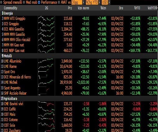 La tabella che segue riporta il trend delle principali materie prime: il comparto energetico guida il rialzo.