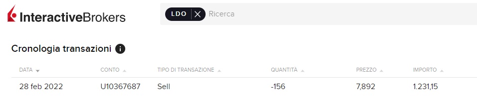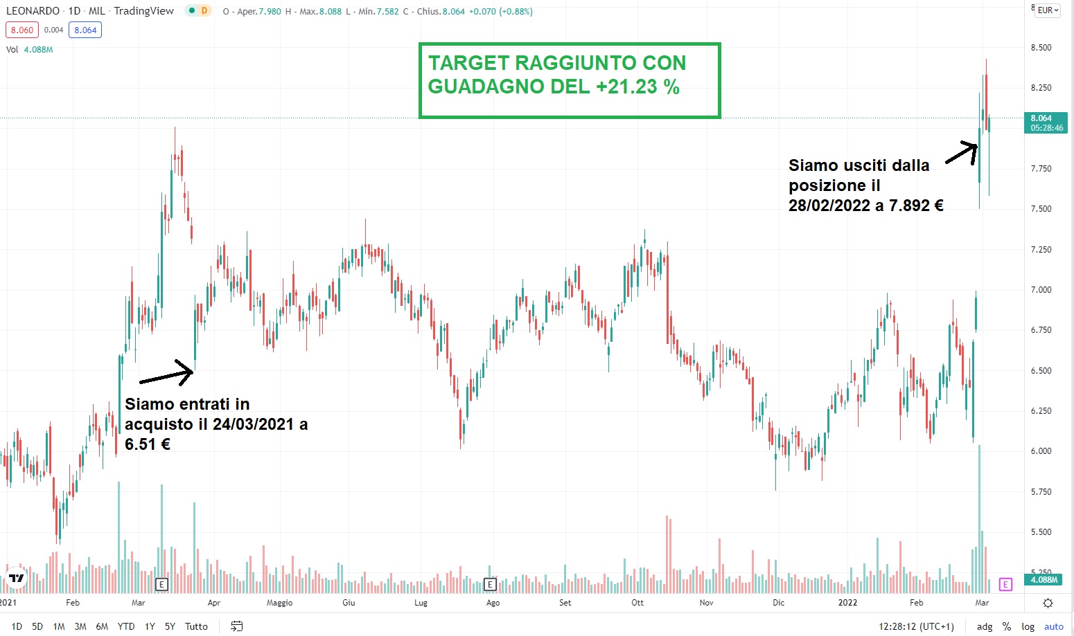 Come potete vedere siamo entrati in acquisto lo scorso 24/03/2021 a 6.51 € e siamo usciti dalla posizione vendendo il 28/02/2022 a 7.892 €.