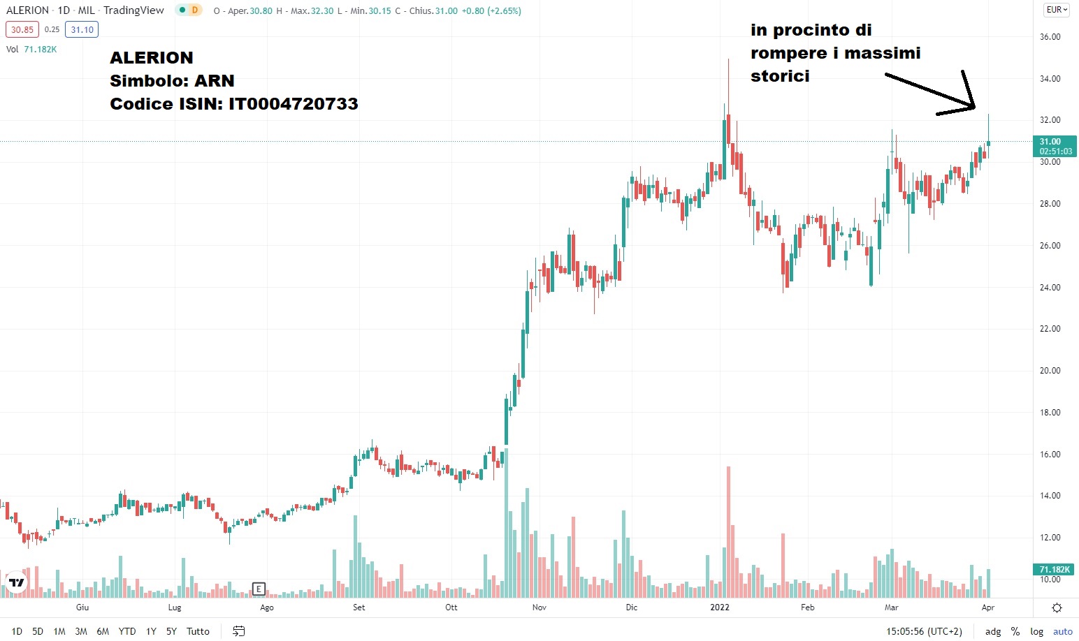 ALERION: tecnicamente è un buy visto che si accinge a rompere i massimi storici ma fondamentalmente quota quasi 2 volte il fair price che dai nostri calcoli si aggira sui 14 euro. A livello di debito è molto tirata con un cash to dbt di 0.16 ovvero ha sul conto corrente 16 centesimi per 1 euro di debito e l’interest coverage è di 1.82 ovvero ha soldi per pagare gli interessi passivi per poco meno di 2 anni. Buona la crescita di Ebitda e di fatturato sugli ultimi 3 anni anche se il p/e è di 37 e il PEG ratio di 1.63. Stiamo fuori.
