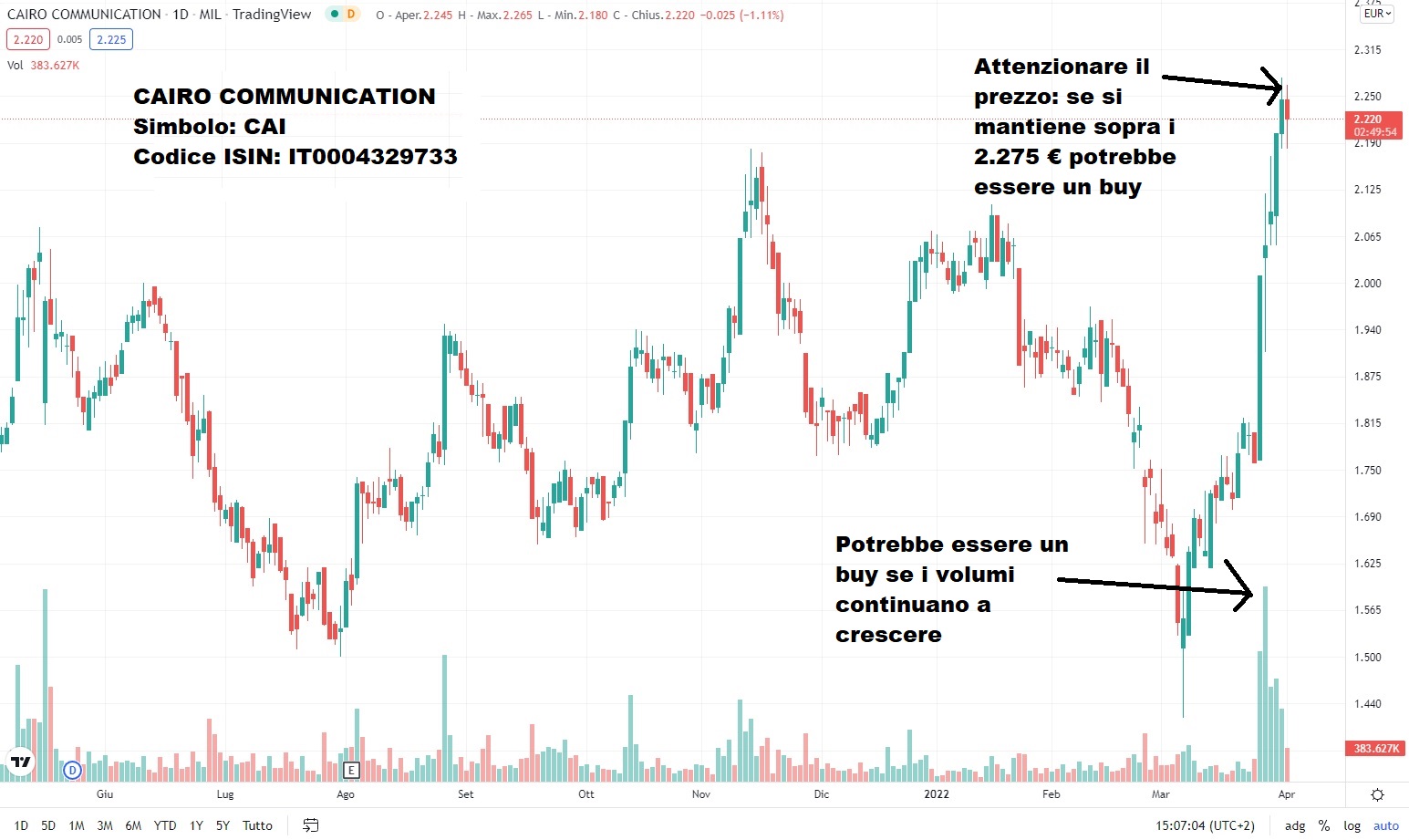 CAIRO COMMUNICATION: quota a valori corretti sul fair price. Debito in aumento esponenziale negli ultimi 5 anni. P/E ridicolo a 5.58 ma giustificato da una crescita dell’EBITDA su 5 anni del 27.7% (PEG ratio a 0.19 dove se il PEG ratio è inferiore a 1 è sottovalutato). Diciamo che potrebbe essere un bottom up perché tecnicamente è partitA in tromba. Soprattutto se si mantiene sopra 2.275 e soprattutto se i volumi continuano a pompare come fanno ora potrebbe (notare condizionale) essere un buy.