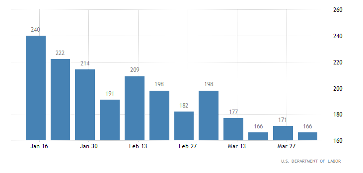 Quarta rilevazione consecutiva che segna un calo per le richieste iniziali di sussidi di disoccupazione che mostrano un mercato del lavoro estremamente tirato. Nella settimana terminata il 2 aprile hanno toccato quota 166 mila, registrando un nuovo minimo dal 1968, contro un consensus di 200 mila. Nella settimana terminata il 26 marzo le richieste iniziali erano state 171 mila (dato rivisto da 202 mila). Il dato è rilasciato dall’U.S. Department of Labor.