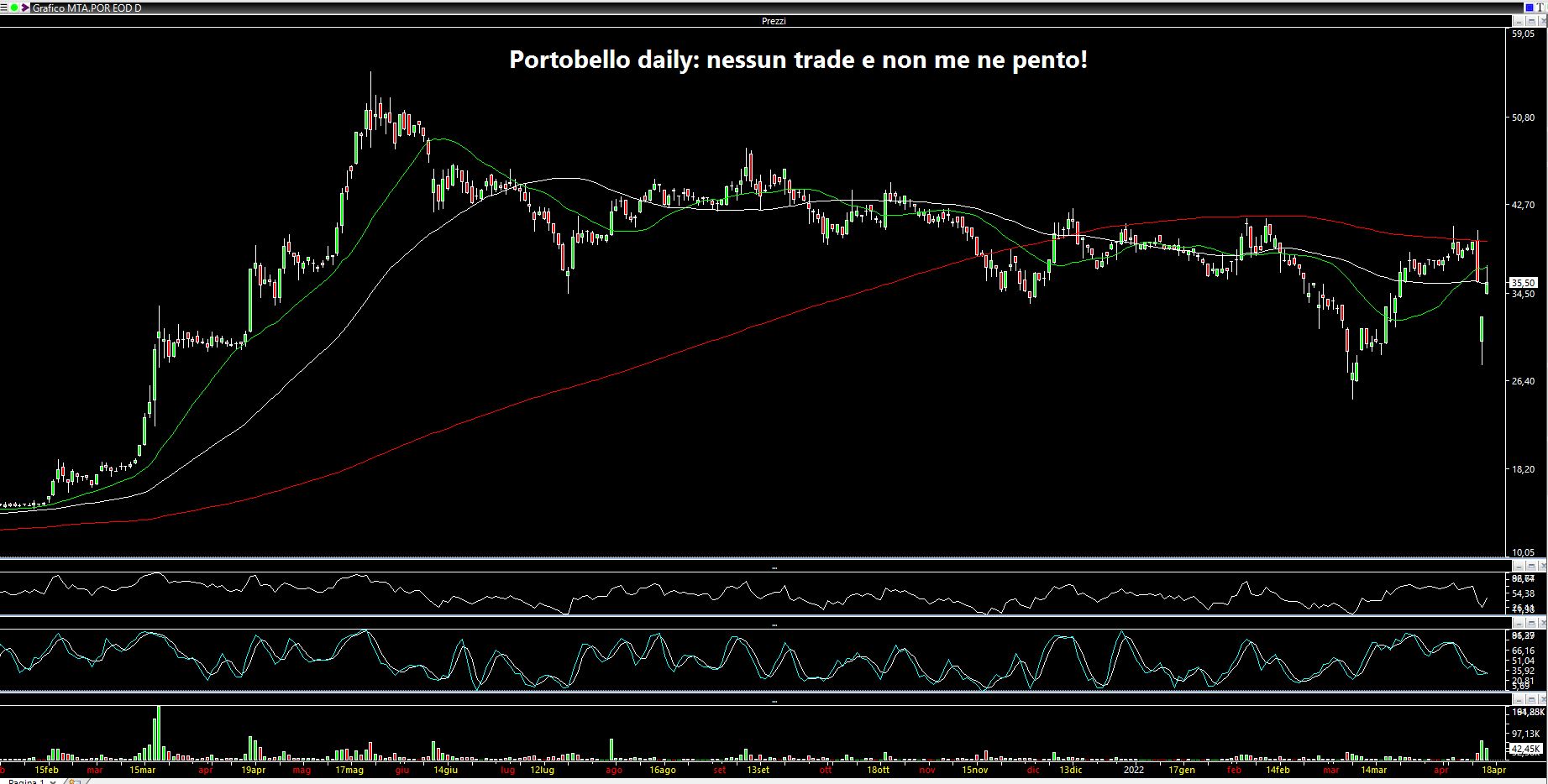 Certamente per un trade studiato ce ne sono altri per i quali non mi pento assolutamente di non aver toccato mouse e di non aver messo un euro (penso ad esempio a Portobello che è rimbalzata davanti ai miei occhi fino a chiudere completamente il gap down in seguito alle notizie relative alle indagini giudiziarie). A differenza del caso precedente (STM) il problema è che su notizie particolarmente "delicate" le azioni diventano potenziali derivati fuori dal nostro controllo e quindi ingestibili, almeno dal mio punto di vista e per come opero io.