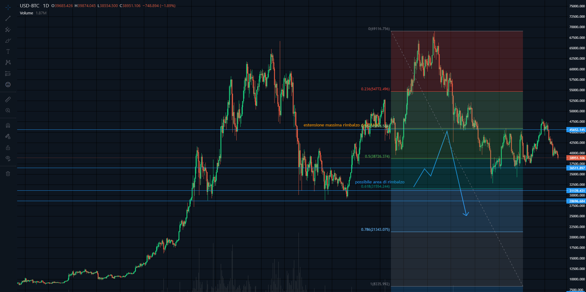 In una precedente analisi, pubblicata peraltro in un recente articolo e qui riproposta senza apportare alcuna modifica, si era individuata una possibile area di rimbalzo in zona 30000$.