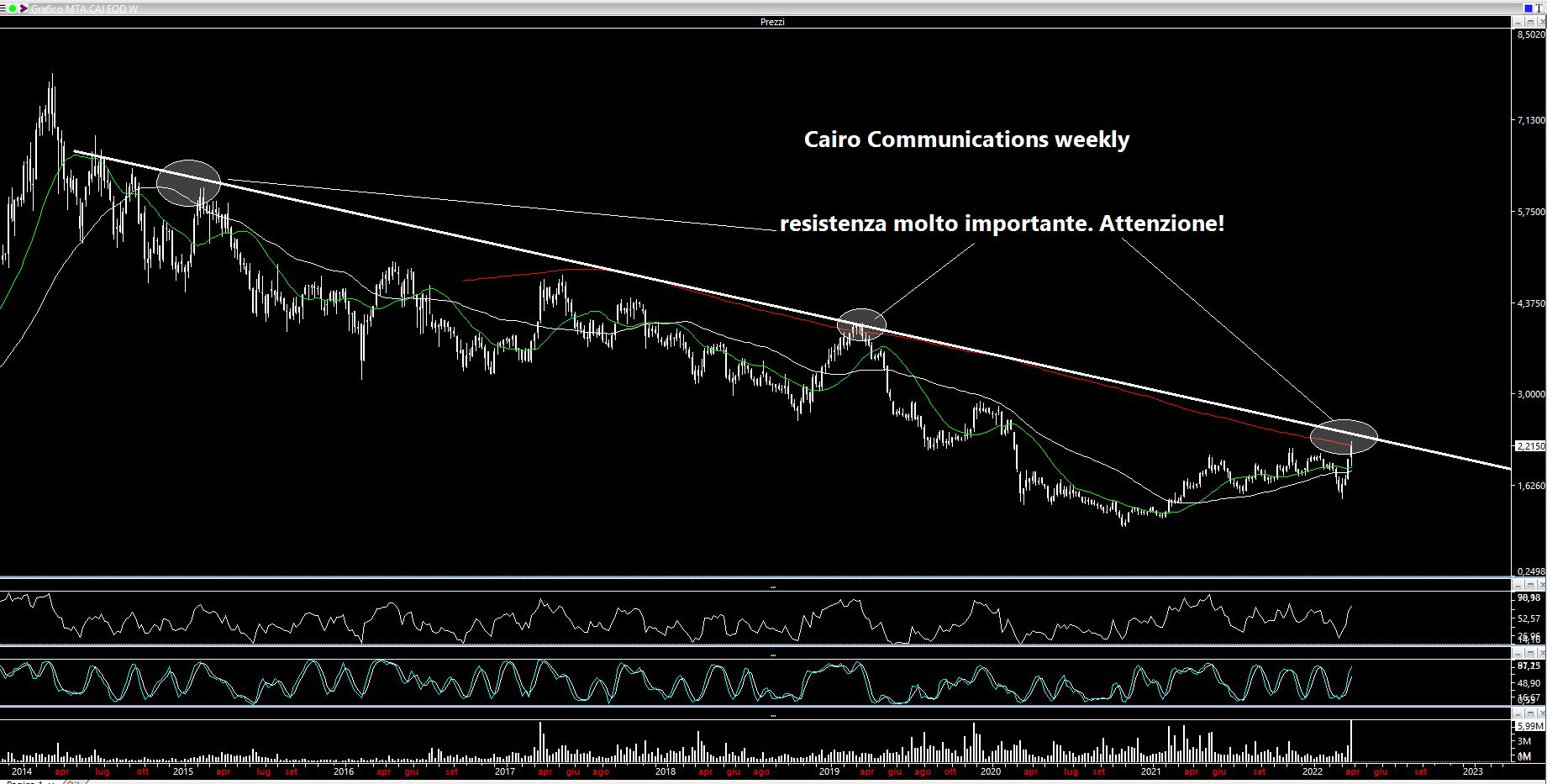 Buona performance settimanale con un rialzo secco superiore al 10% in sole cinque sedute, con un massimo weekly a 2.275 euro dai 2.01 euro del close di venerdì scorso. Volumi però in leggera discesa nelle ultime due sedute. Valgono le considerazioni già esposte sabato scorso alle quali Vi rimando (link: https://www.lombardreport.com/2022/3/26/apatia-generalizzata/). I target sono stati centrati ma bisognerà valutare il comportamento a ridosso dei livelli di lunghissimo periodo che avevo indicato. Di seguito trovate in sequenza il grafico daily dell'ultima settimana e quello weekly. Il quadro tecnico rimane ben impostato specialmente se continueranno i volumi ma come ho scritto in precedenza è importante sapersi accontentare o alleggerire anche perché questa settimana abbiamo toccato la media mobile a 200 periodi sul settimanale e stiamo lambendo una importantissima resistenza dinamica che ha letteralmente compresso le quotazioni dal 2014 ad oggi. In questo momento c'è poca liquidità quindi spesso capita che i titoli si spingano verso un limite per poi rimangiarsi mano a mano il movimento. Non credo sia questo il caso ma la cautela è d'obbligo.