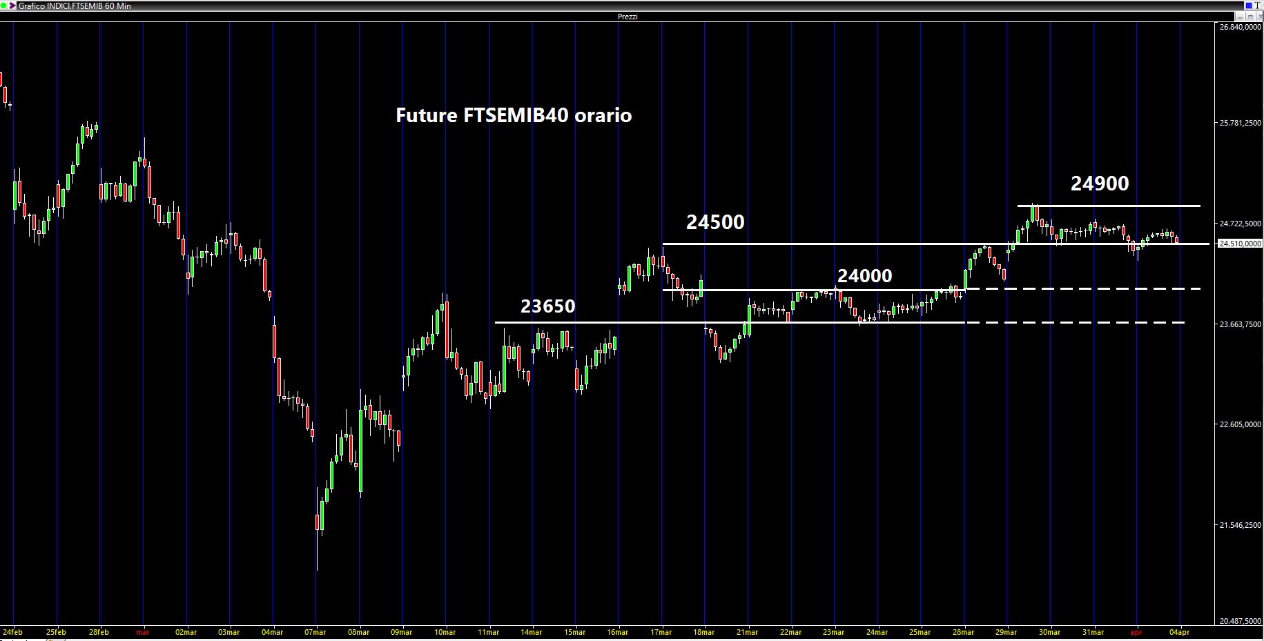 Per le prossime cinque sedute sul Future FTSEMIB40 monitorerò i 24900 (massimo settimanale), i 24500 su cui abbiamo gravitato la maggior parte della settimana, poi i 24000 ed infine sempre i 23650.