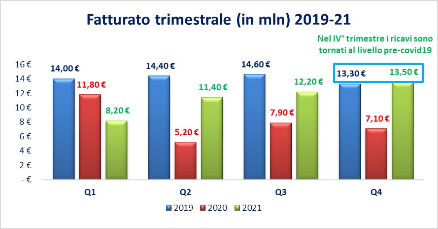 In termini assoluti, la distanza rispetto ai volumi pre-Covid19 sono ancora notevoli, ma l’ottimo IV° trimestre 2021 ed il portafoglio ordini del 2022 rendono possibile, già nel 2022, il ritorno alla fase pre-pandemica.