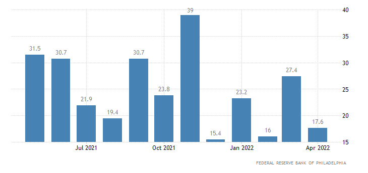 Calo significativo per il Philadelphia Fed manufacturing Index, che dai 27,4 punti di marzo scivola ai 17,6 punti di aprile, sotto al consensus di 21,0 punti.