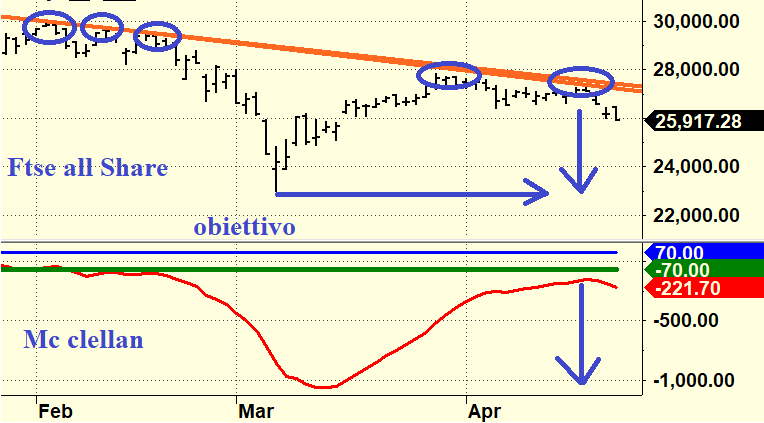 Ma torniamo al nostro mercato: se oggi avremo una chiusura sotto il livello da noi indicato precedentemente come spartiacque tra rialzo e ribasso ovvero indicativamente sotto 26.000 del Ftse All Share allora andiamo direttamente al minimo di 23.000. Se notiamo l’indicatore Mc Clellan è posizionato in modalità tutto sommato neutrale e quindi ha ancora spazio per un ulteriore ribasso. Francamente non vedo un crollo, vedo un lento scivolare verso il basso con puntate rialziste di un certo rilievo.